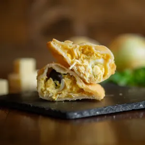 Rellena de crema pastelera, pollo desmechado, pino de carne y huevo.